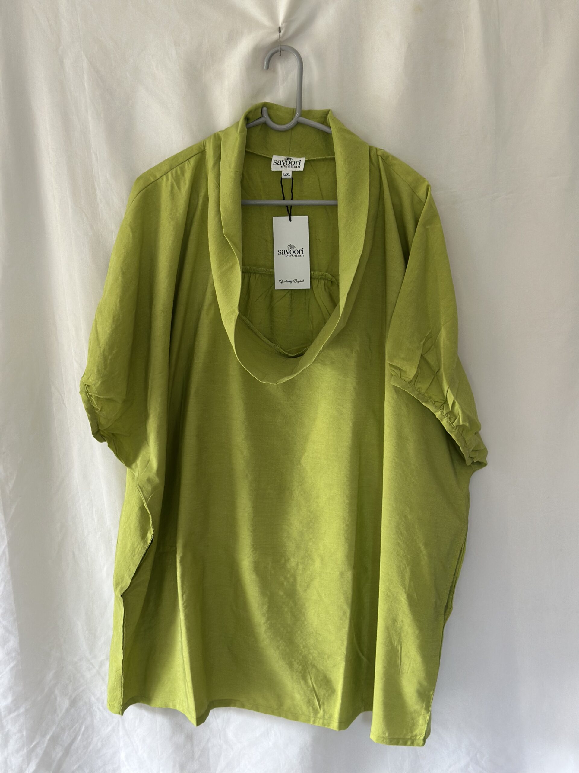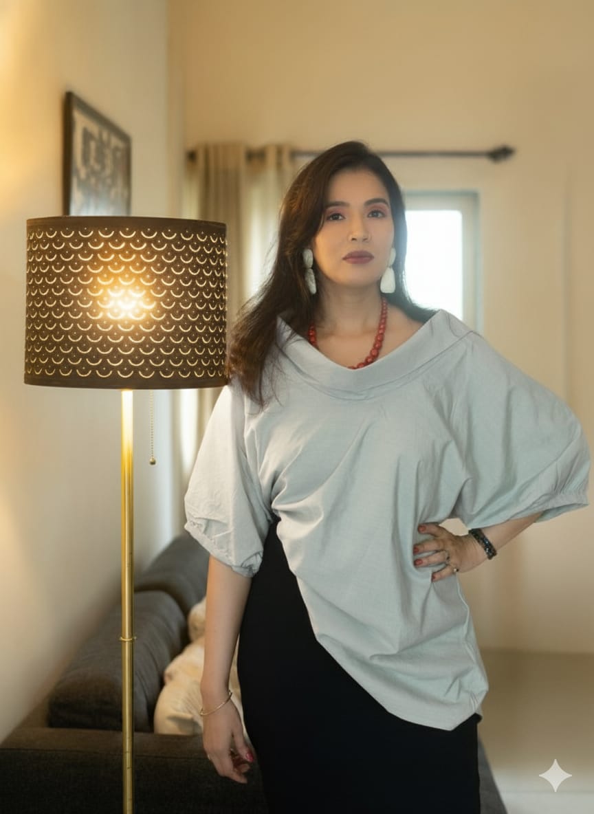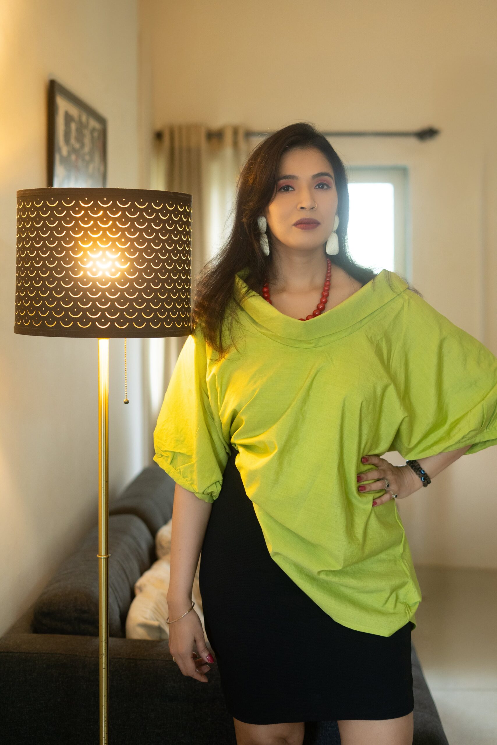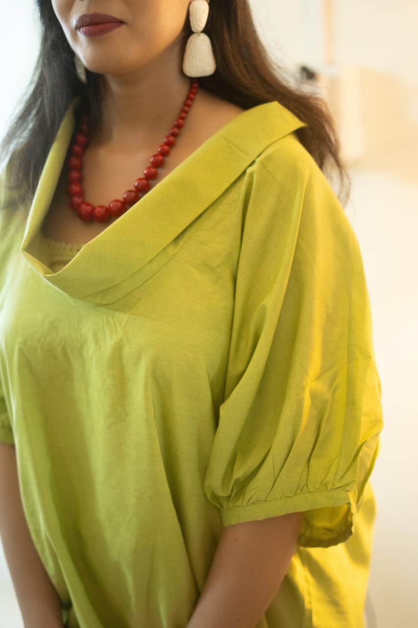 Frost Fern is a cowl-necked top crafted in soft cotton-silk, offering a luxurious drape in soothing pastel shades. Mid-thigh length and thoughtfully designed with pockets, it balances elegance with practicality.