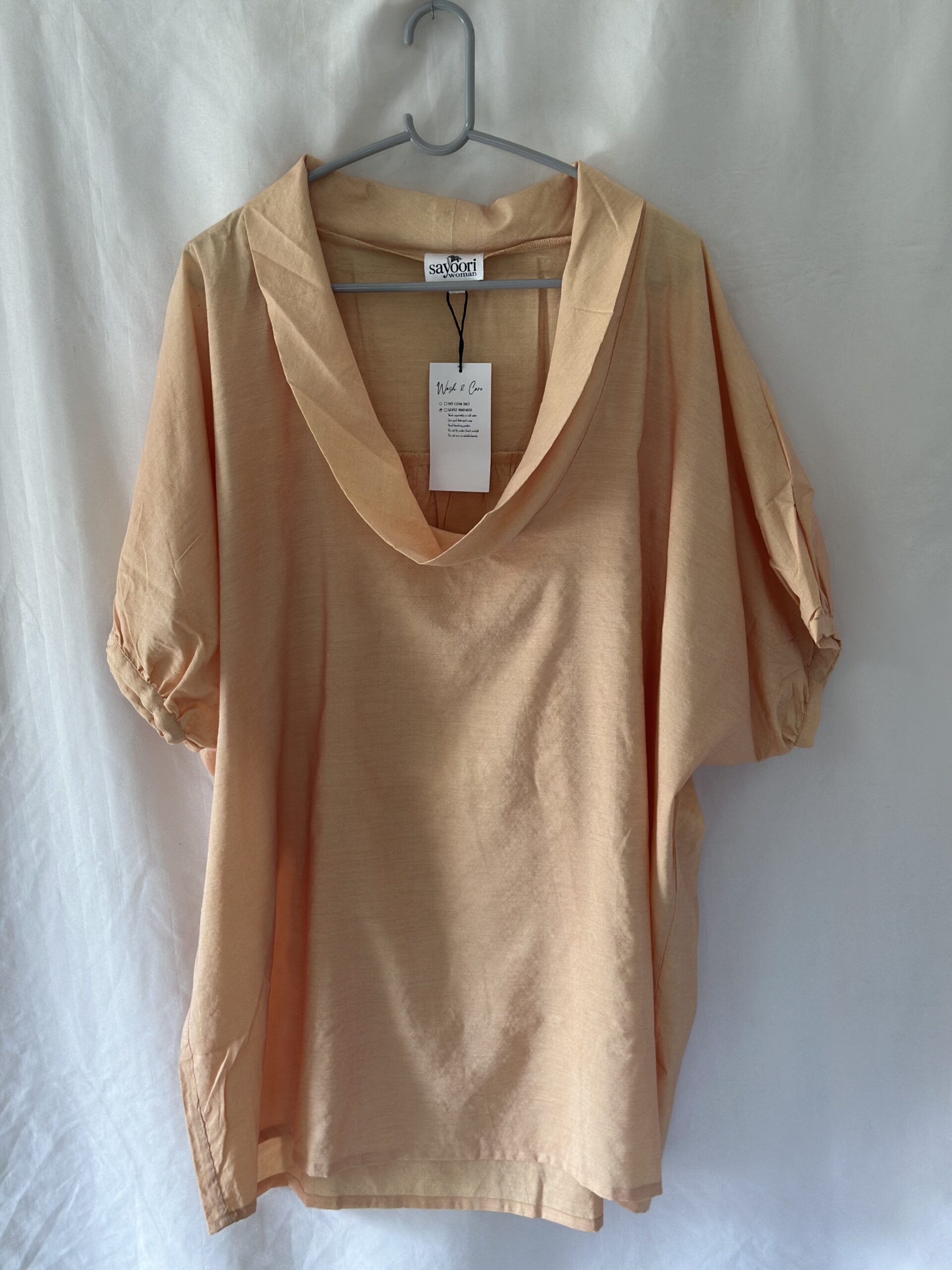 A cotton-silk cowl-necked top with a voile inner that comes with adjustable straps.