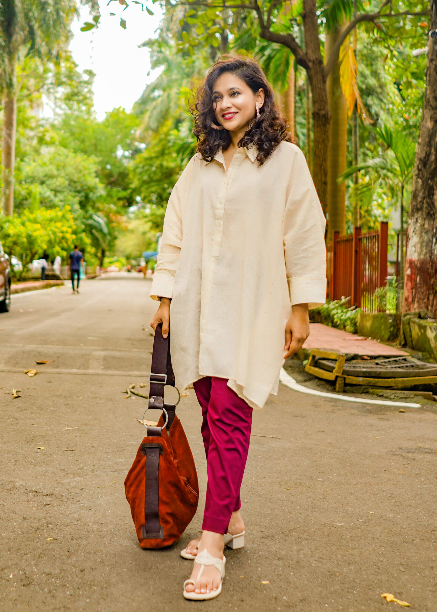 Handwoven fine cotton tunic top with pockets and raglan-style sleeves.