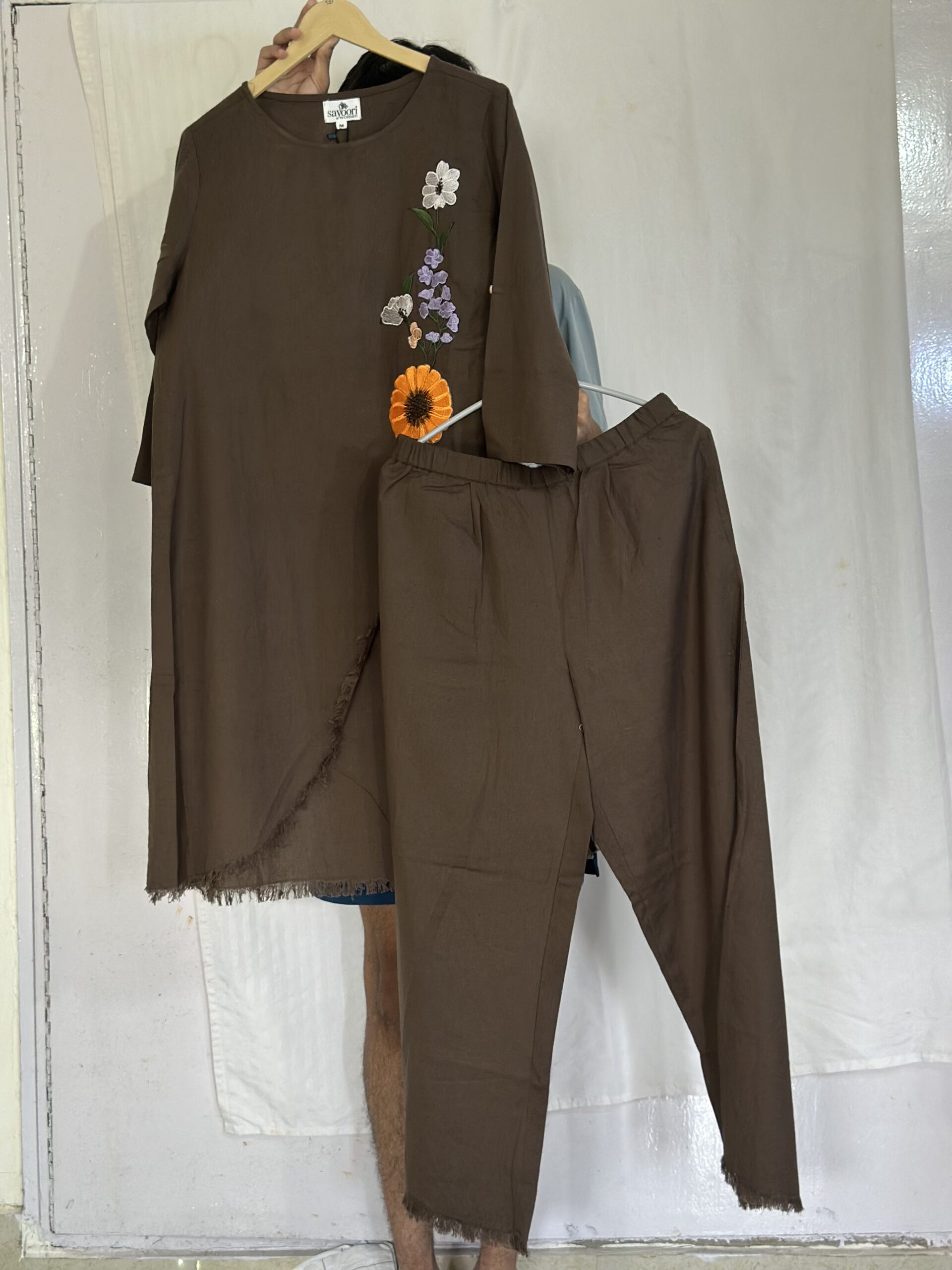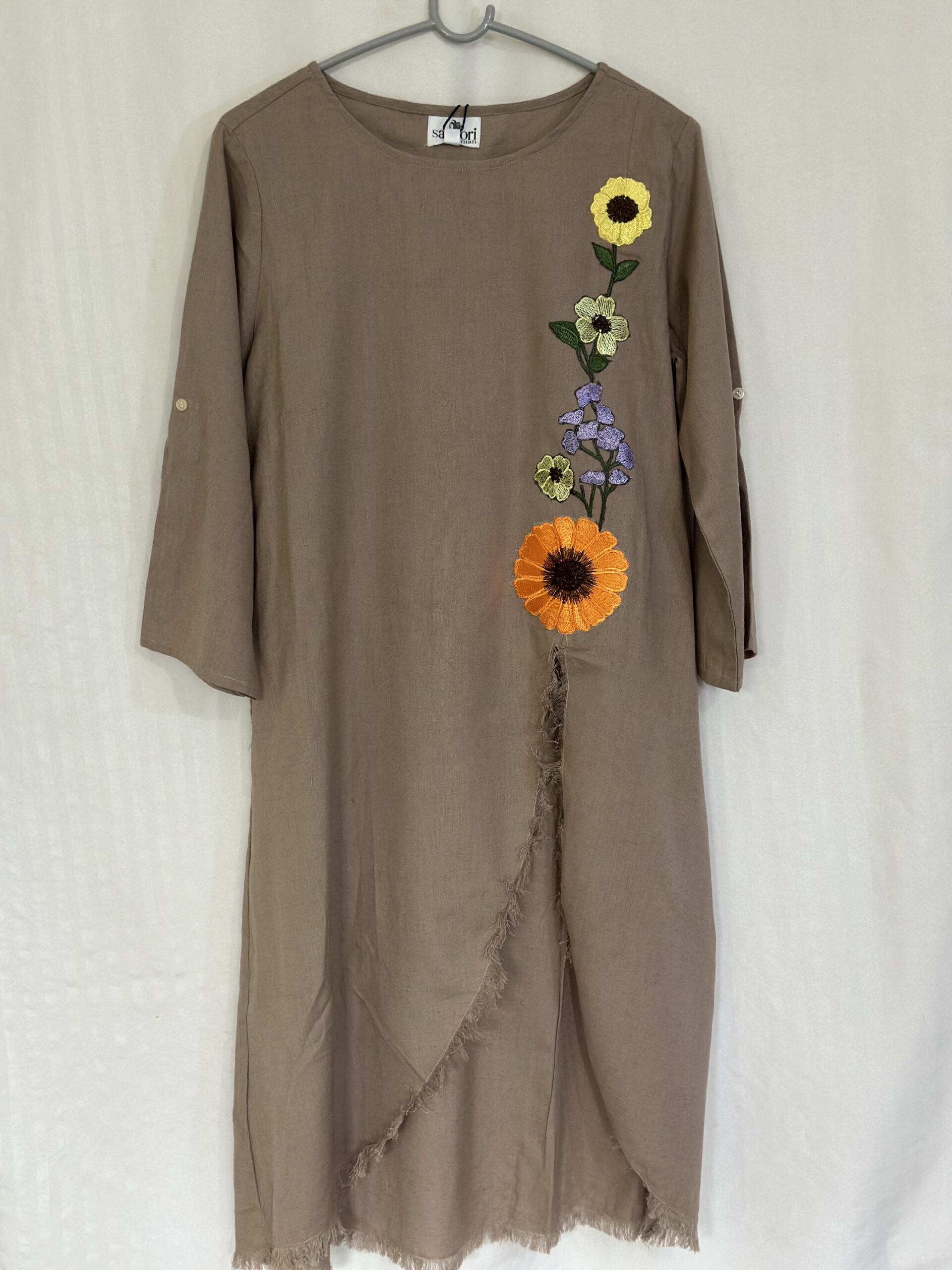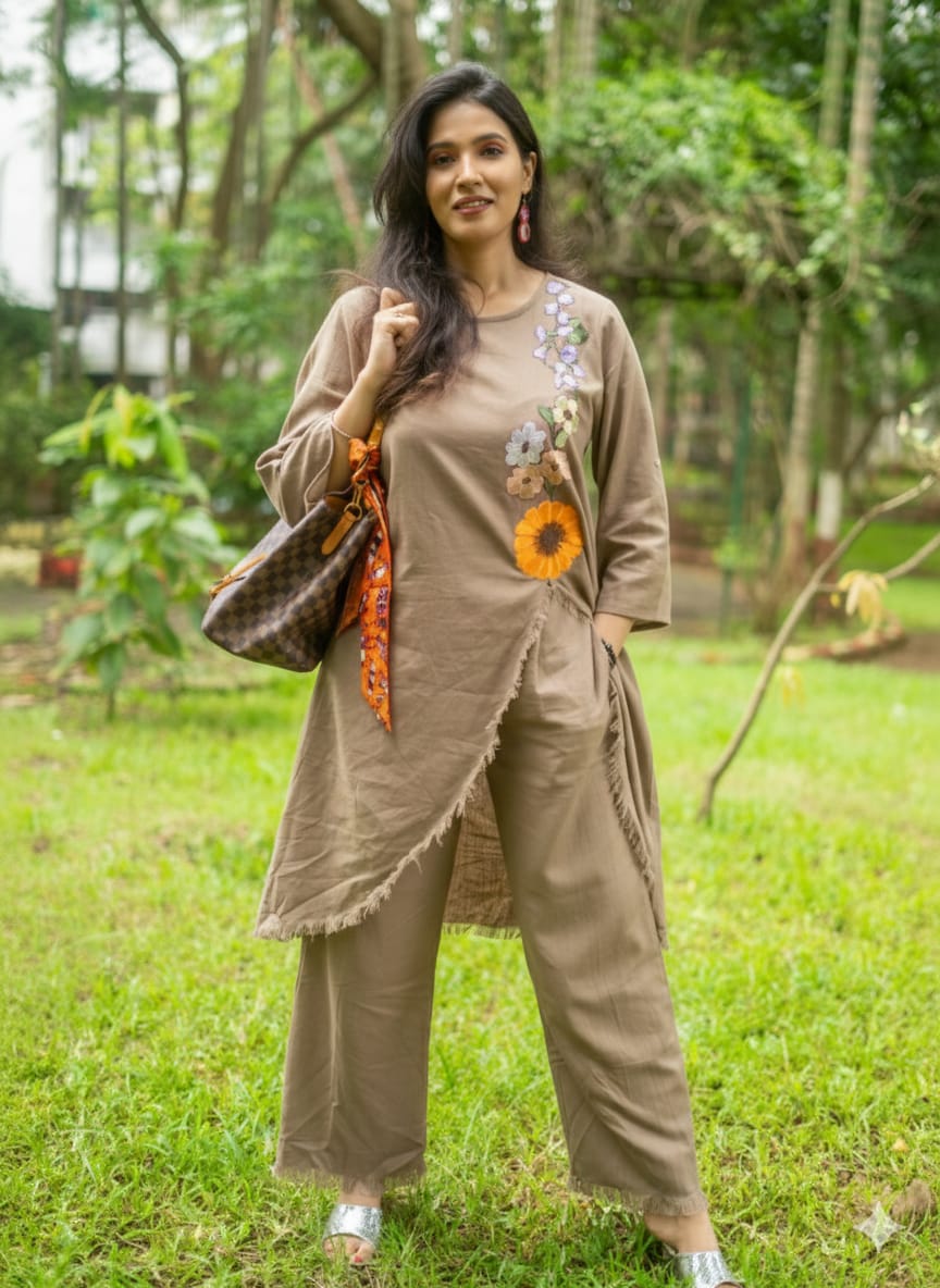 A breezy co-ord in natural cotton linen, designed for ease and elegance. The asymmetrical tunic, embroidered with delicate floral patchwork, pairs effortlessly with matching trousers, while roll-up sleeves add a touch of versatility.