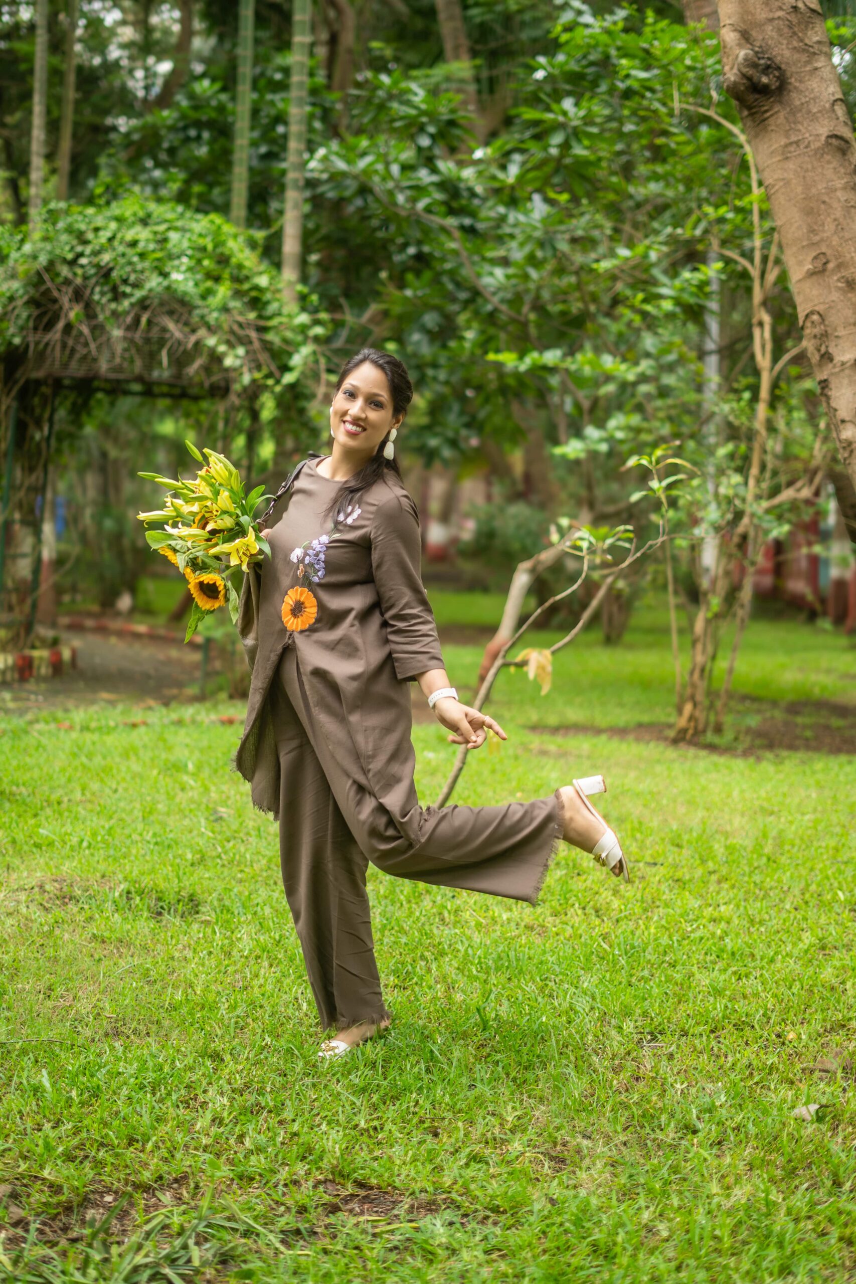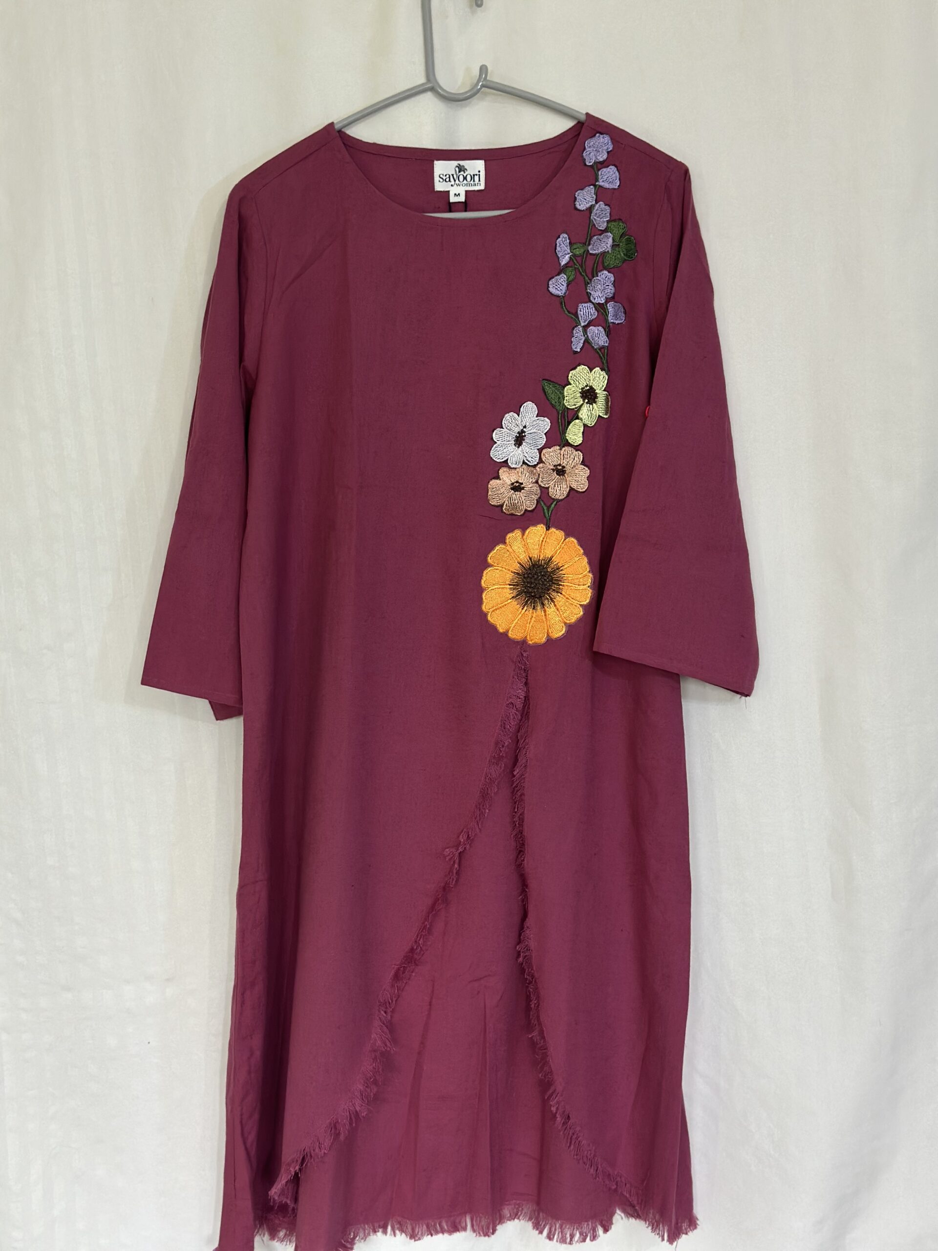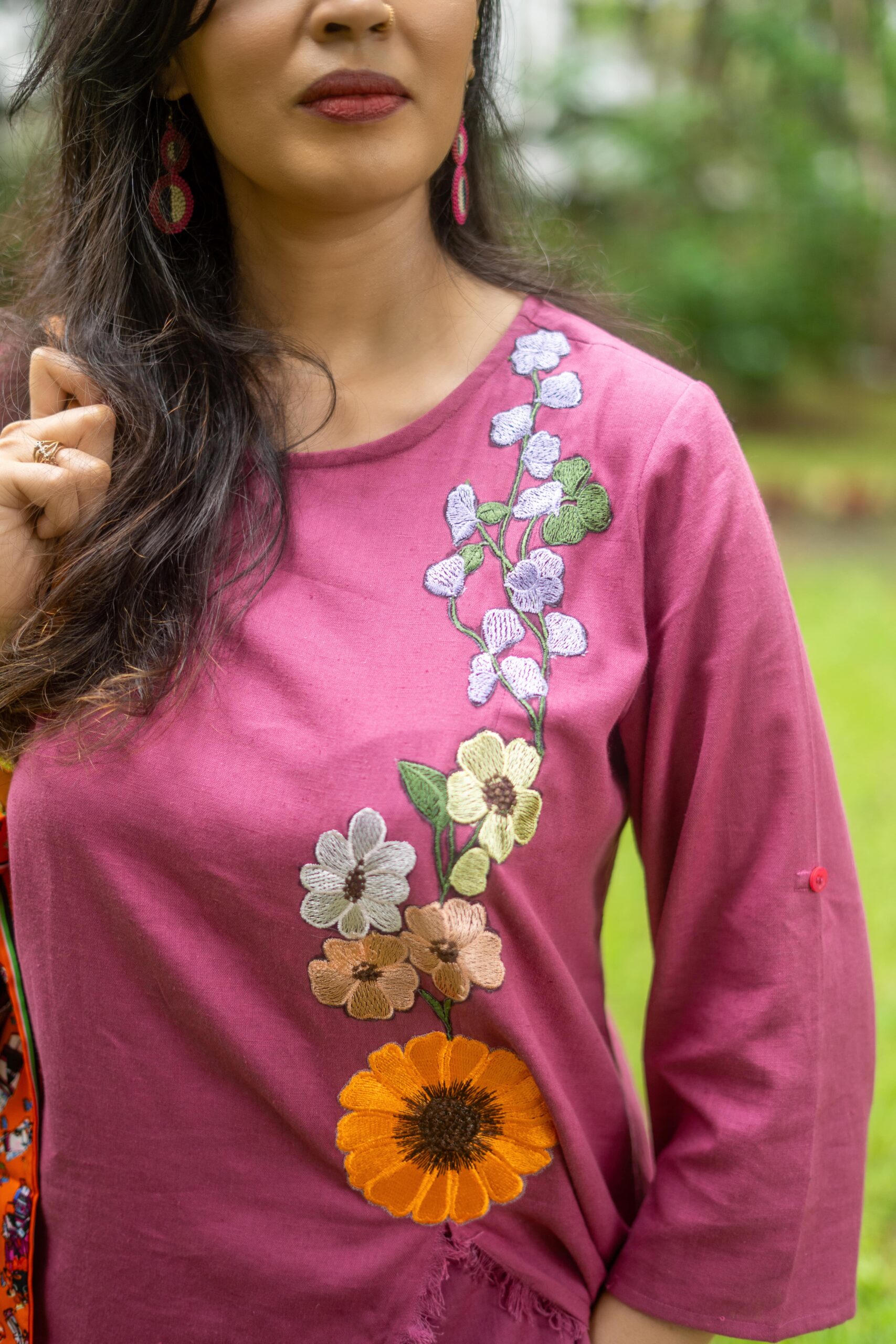 A breezy co-ord in natural cotton linen, designed for ease and elegance. The asymmetrical tunic, embroidered with delicate floral patchwork, pairs effortlessly with matching trousers, while roll-up sleeves add a touch of versatility.